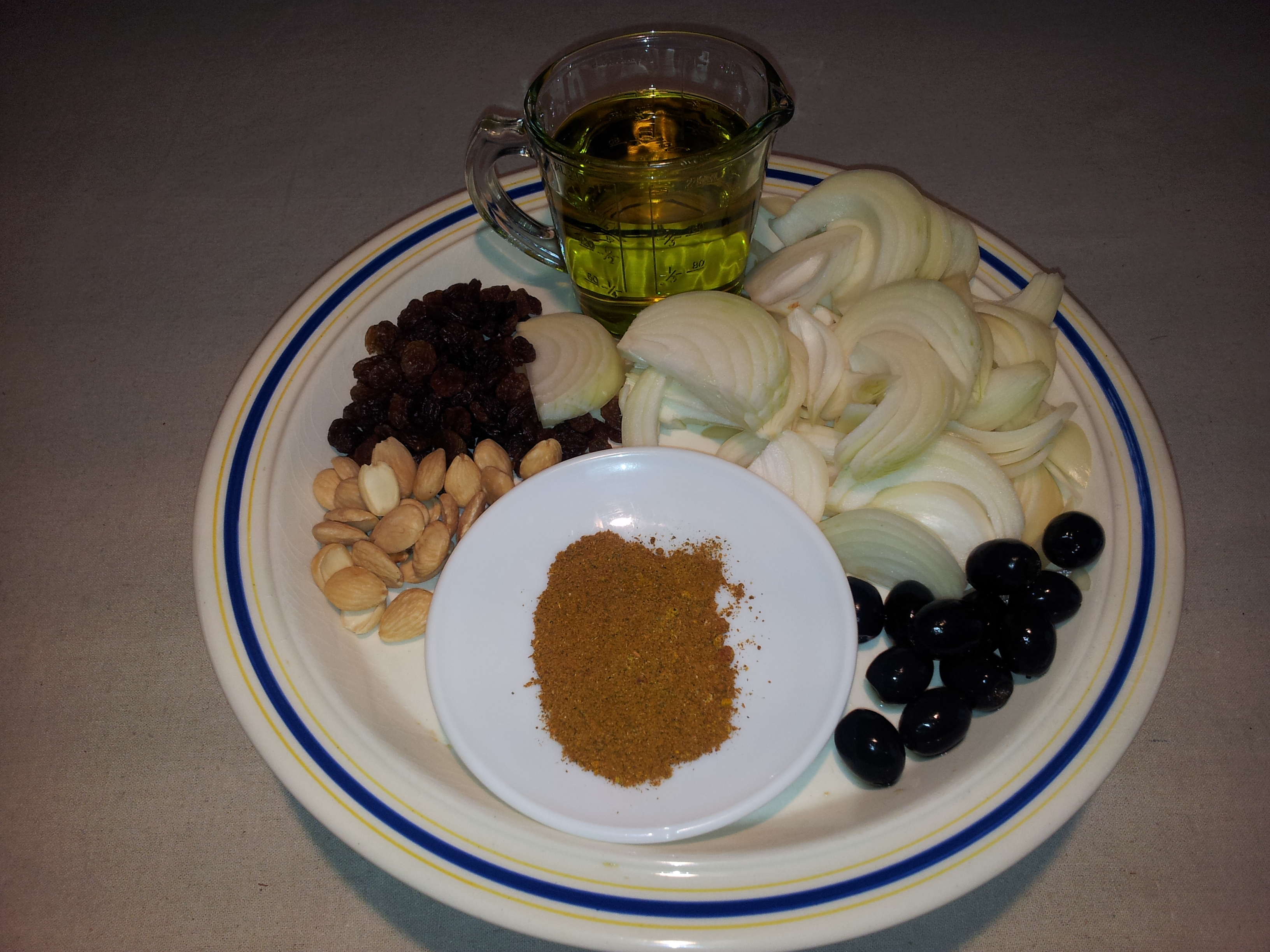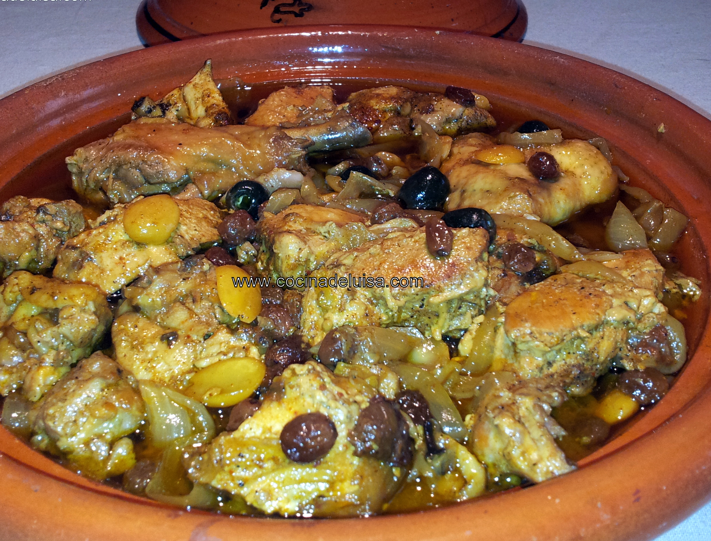 Ingredientes para seis personas: 1 pollo troceado, tres cebollas, 100 gr. de uvas pasas, 50 gr de almendras peladas y crudas, 50 gr de aceitunas negras (preferentemente de tipo griego), 300cc de aceite de oliva virgen extra, un limón troceado en cuatro y especias variadas.