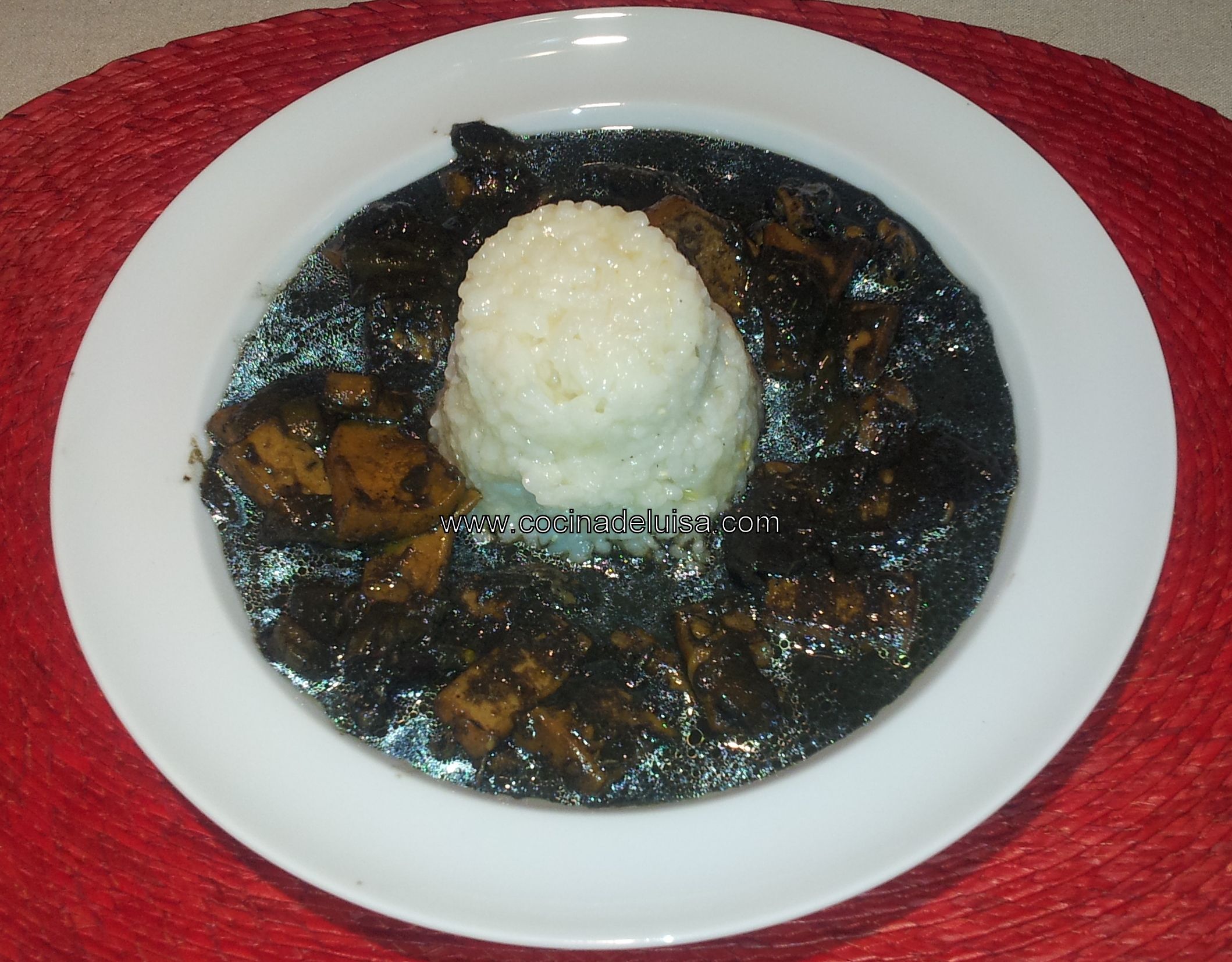 1 kg. de calamares con su tinta, 1 cebolla grande, 1 tomate, 1/2 diente de ajo, 1 vaso pequeño de sidra dulce, perejil, una rebanada de pan, pimentón, sal, pimienta y una pizca de canela. Arroz en blanco.