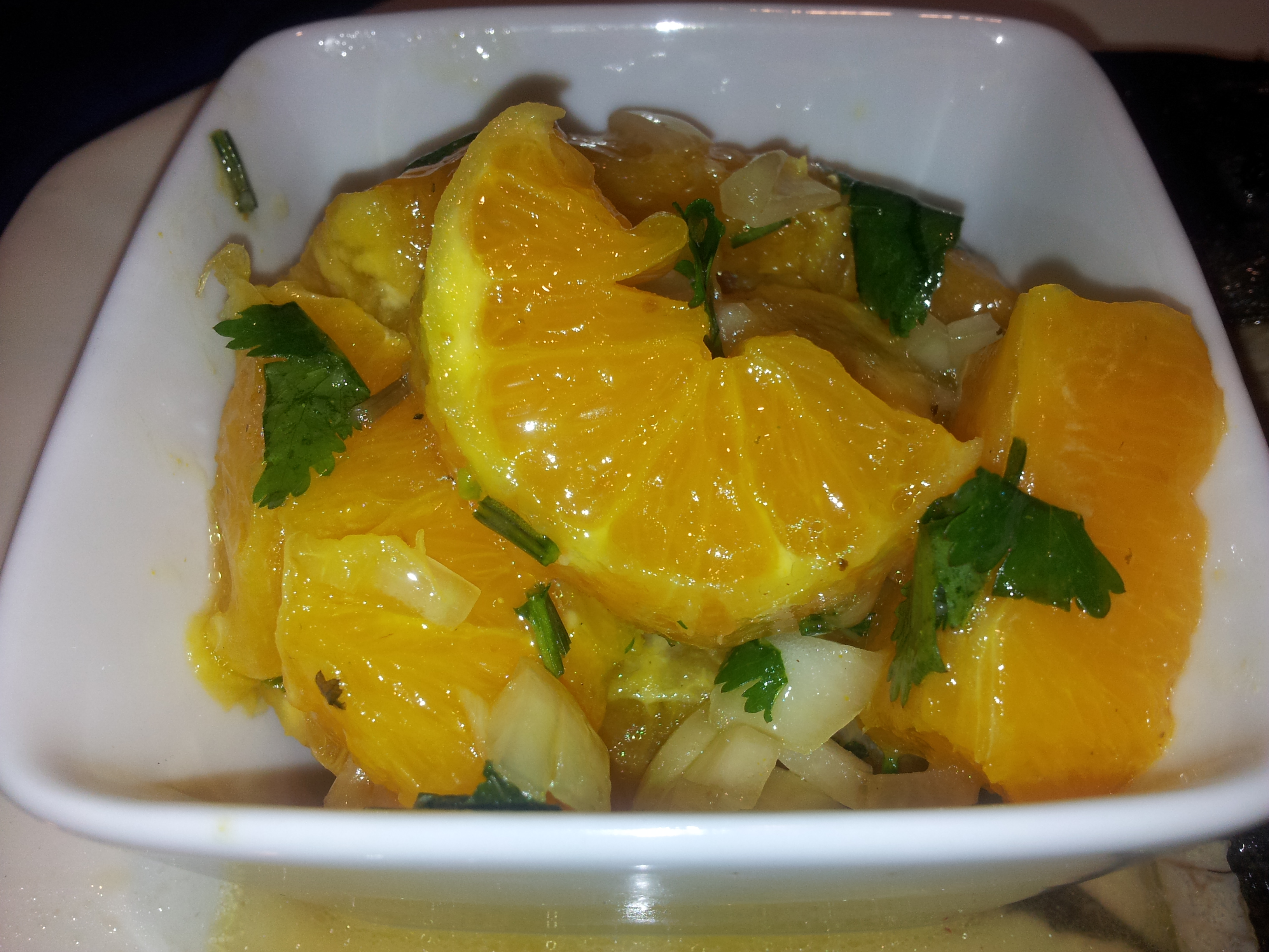 Pelar y cortar las naranjas en trozos. Poner por encima una emulsión de aceite, vinagre, sal y mostaza en grano. Remover y poner por encima cilantro picado.