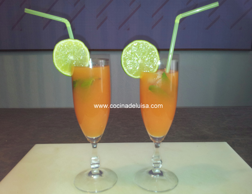 1 melón de la variedad Galia si es posible. 1 mango. 1 naranja. dos melocotones. 1 manzana. 8 uvas grandes. 2 limones. 1 vasito de ron. 2 cucharaditas de azúcar de caña.1 ramito de menta.