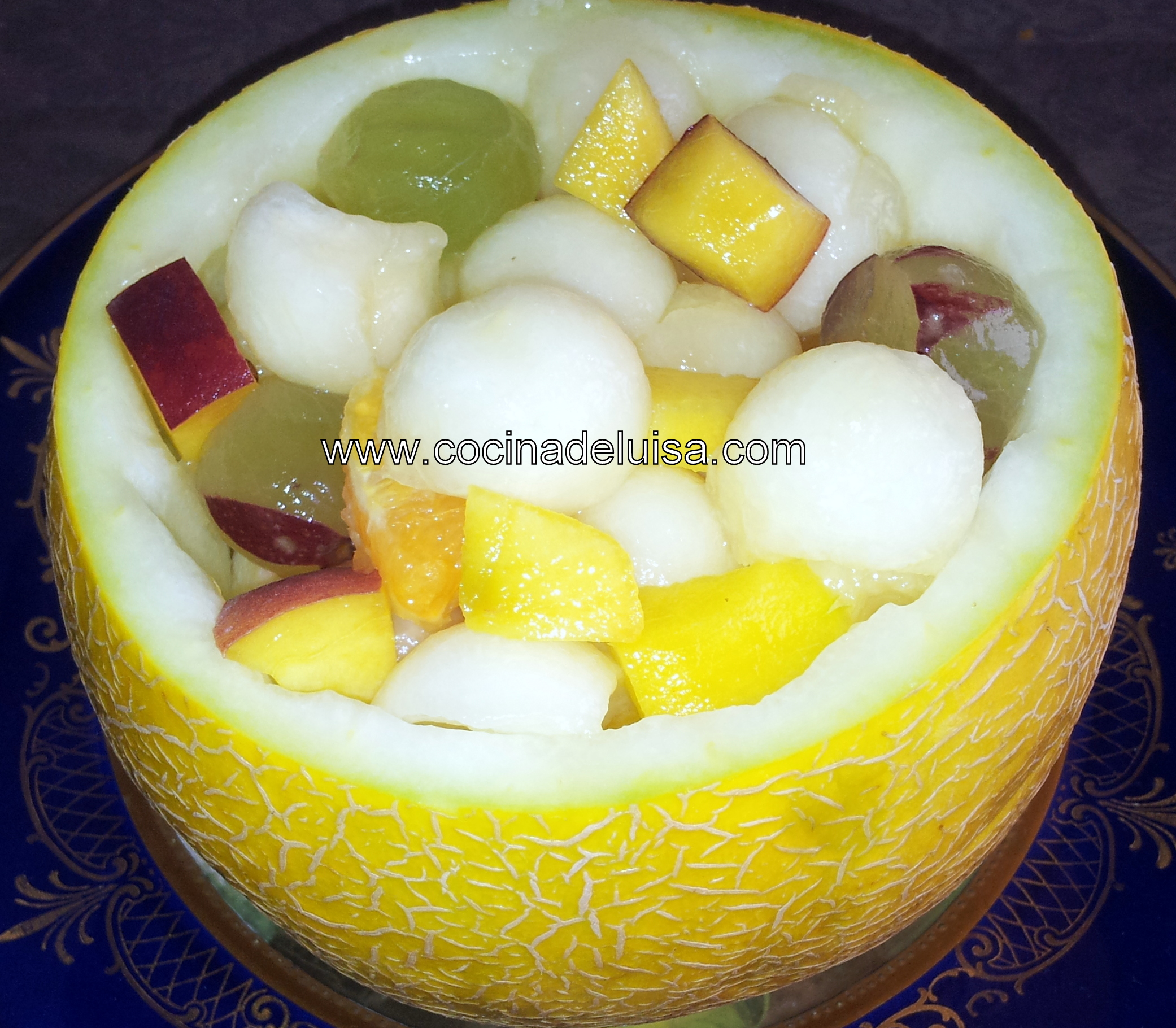 Cortar el melón más arriba de la mitad. Reservar la rodaja más pequeña para tapar. Con una cuchara quitar las semillas. Después vaciar el melón sacando la carne a bolitas con una cucharilla sacabocados. Cortar en dados el resto de la fruta y pelar las uvas. Mezclar todo, exprimir los limones por encima y añadir dos cucharaditas de azúcar de caña y el ron. En el melón vaciado poner un poco de menta picada en el fondo y rellenarlo con la fruta. Taparlo con la rodaja pequeña del melón y ponerlo en el frigorífico para que se enfríe. Diez minutos antes de comerlo ponerlo en el congelador con idea de tomarlo muy frío. Se puede hacer exactamente igual con una sandía.