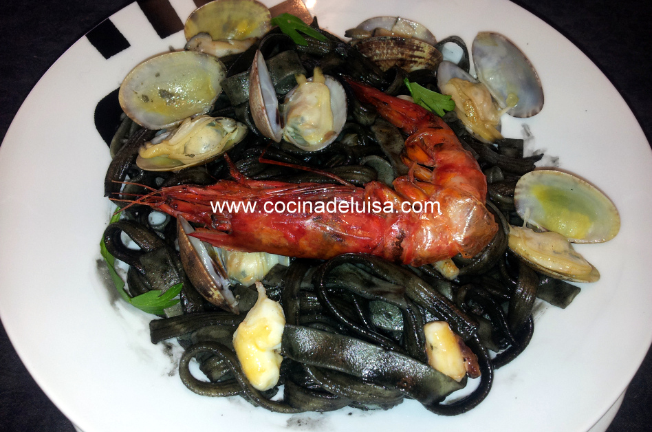 Por otra parte abrir las almejas: Poner en una sartén una pizca de aceite y cuando esté caliente añadir, por este orden, el ajo muy picado, las almejas y el resto del vino blanco. Estar alerta para retirar del fuego las almejas en cuanto abran, con objeto de que no se recuezan y se pasen. Poner todo el caldo que suelten donde tenemos el sofrito y la tinta, remover y echar los tallarines ya cocidos y escurridos. Darles unas vueltas para que se tiñan y cojan sabor y por último agregar las almejas y las gambas peladas. Se pueden servir los platos con alguna gamba entera para contrastar su color rojo con el negro intenso de los tallarines.