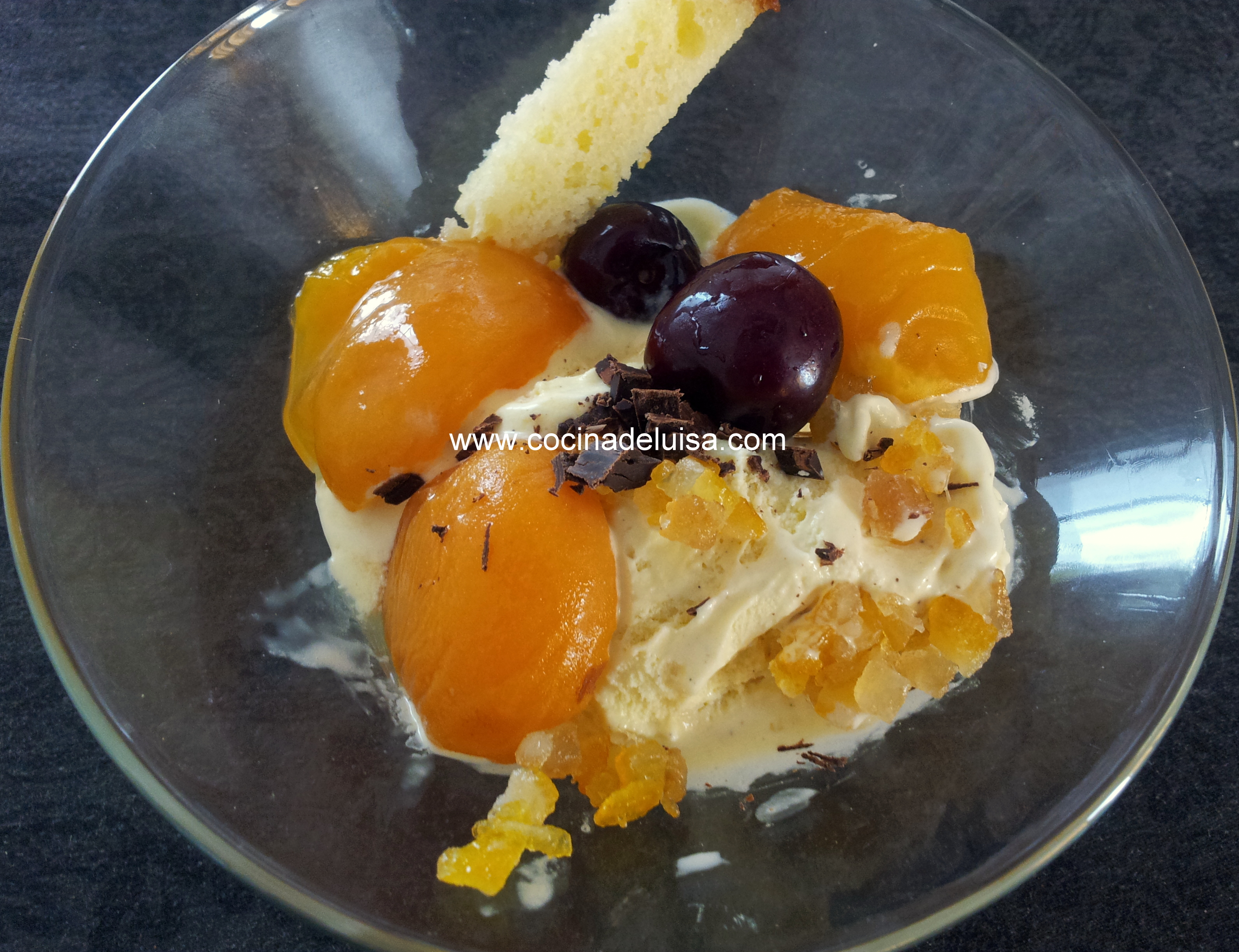 Hacer o comprar helado de vainilla. Poner azúcar en un cazo y el jugo de un limón. Cuando esté a punto de quemarse poner los albaricoques partidos en dos, las cerezas enteras y la fruta que se desee. Tapar y dejar a fuego lento unos minutos para que las frutas suelten su jugo. Apagar antes de que las frutas se pongan lacias para que se queden al dente.