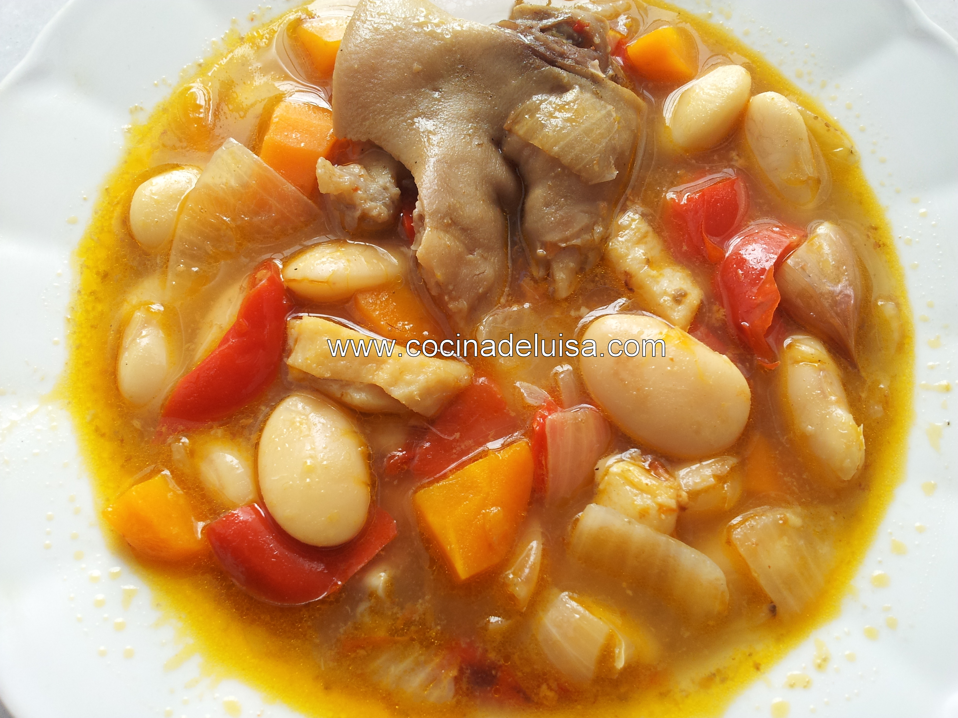 2 tarros de fabes ya cocidas o de alubias normales. 250 gr. de bacalao en salazón, previamente desalado. 3 manitas de cerdo troceadas. 1 cebolla. 1 pimiento rojo. 2 zanahorias. 3 cucharadas de aceite de oliva virgen. 1 cucharada de harina. Pimentón de la Vera. Pimienta negra, clavo y comino molidos. Sal.