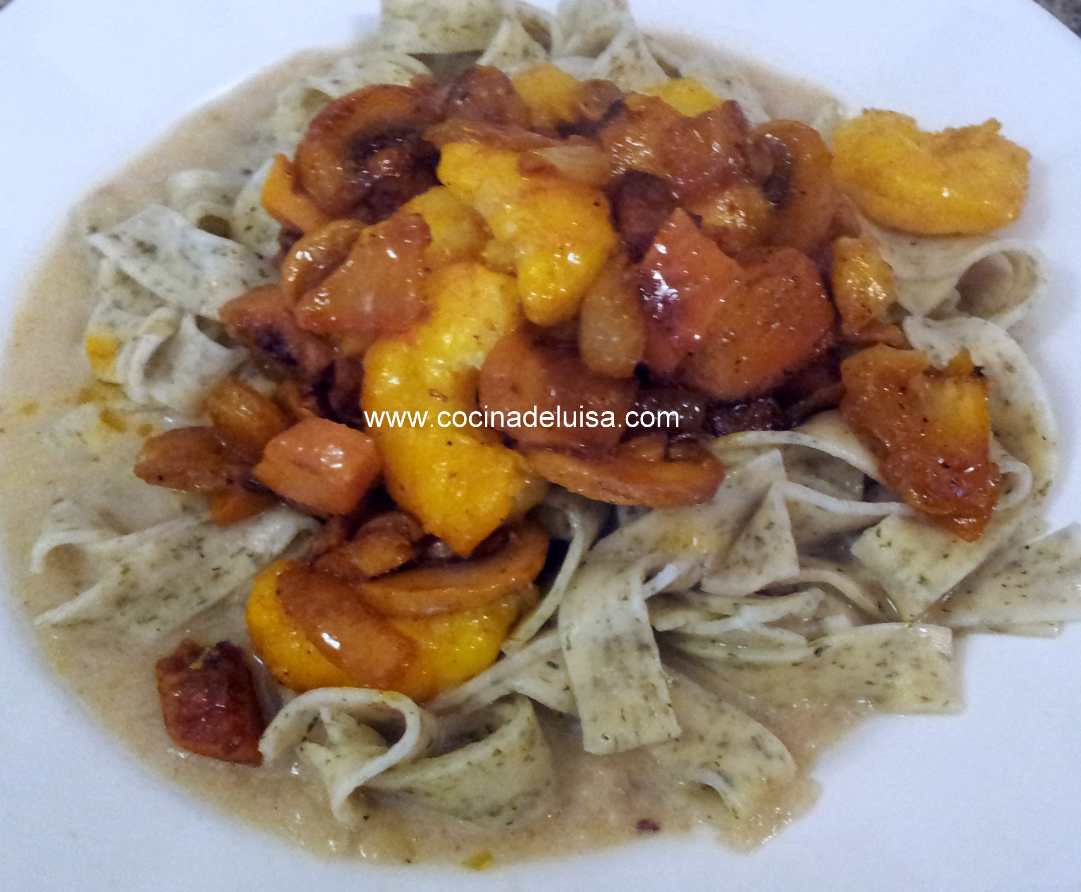 Tallarines al ajo con gambones y setas