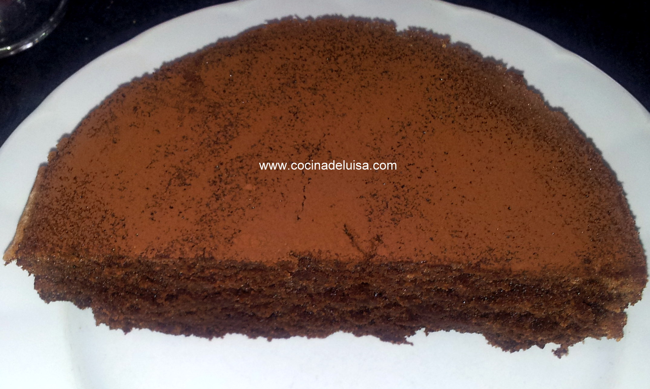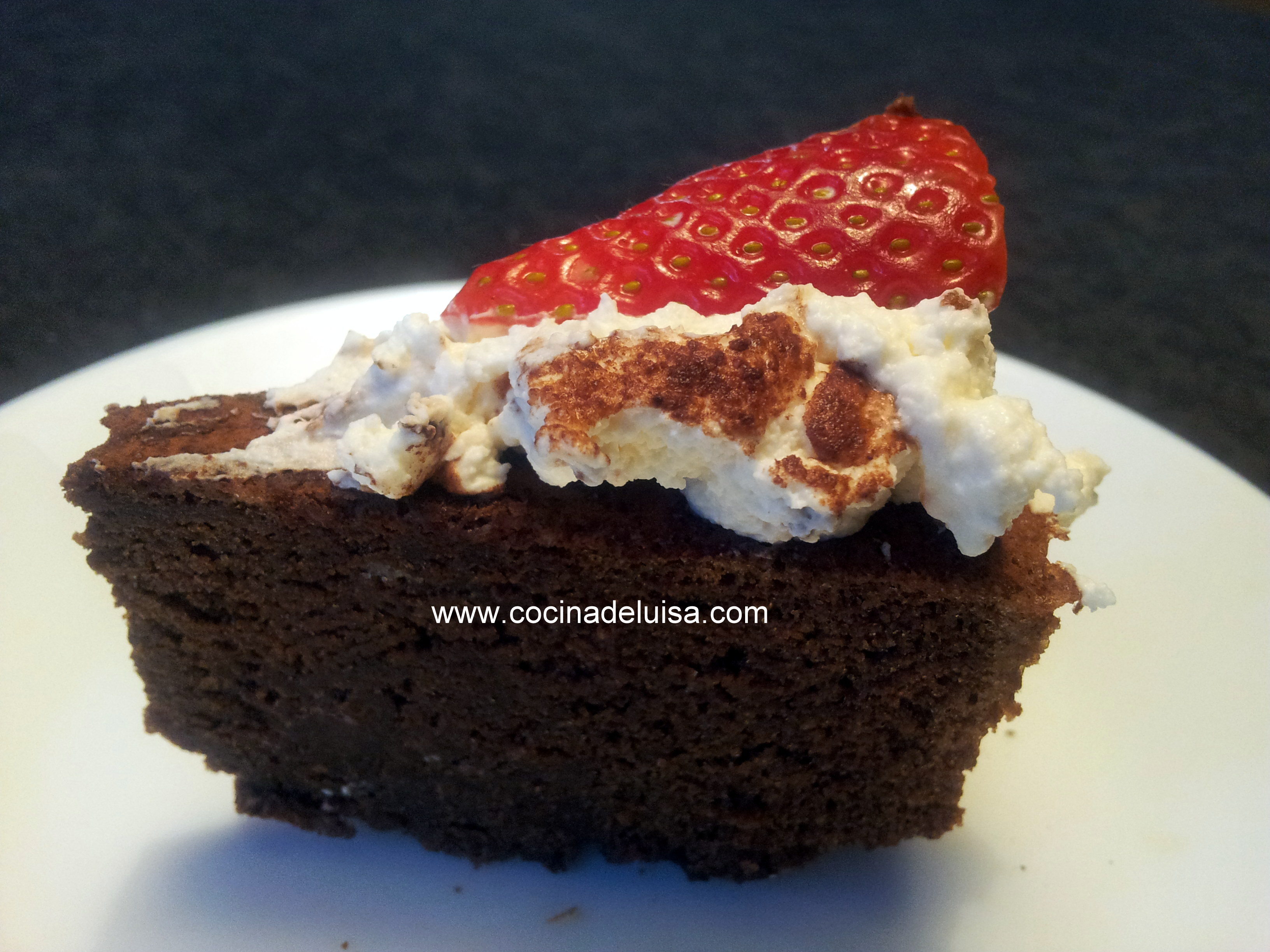 Verter todo en el molde previamente untado de mantequilla y espolvoreado de harina. Hornear a 160º durante 20 minutos. Una vez desmoldado espolvorear con el cacao en polvo. Se puede acompañar con nata chantilly. En este caso se han añadido además fresas de temporada.