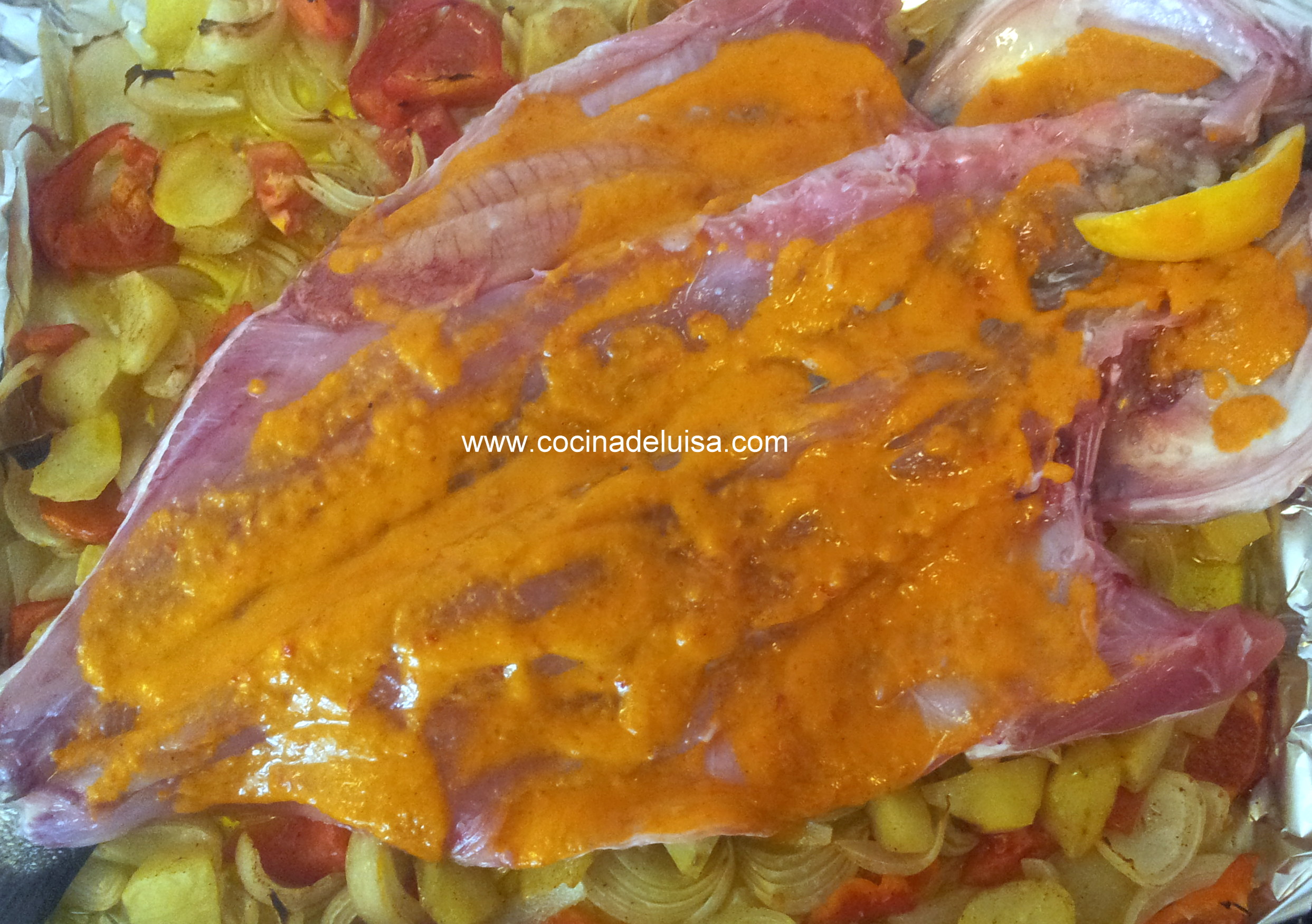 2 kg de lubina salvaje.  2 dl. de aceite de oliva V.E. 3 patatas. 1 cebolla grande. 2 tomates. 1 pimiento rojo. 1 limón. 1 cucharada pequeña de mantequilla. 1 vaso de vino blanco afrutado.