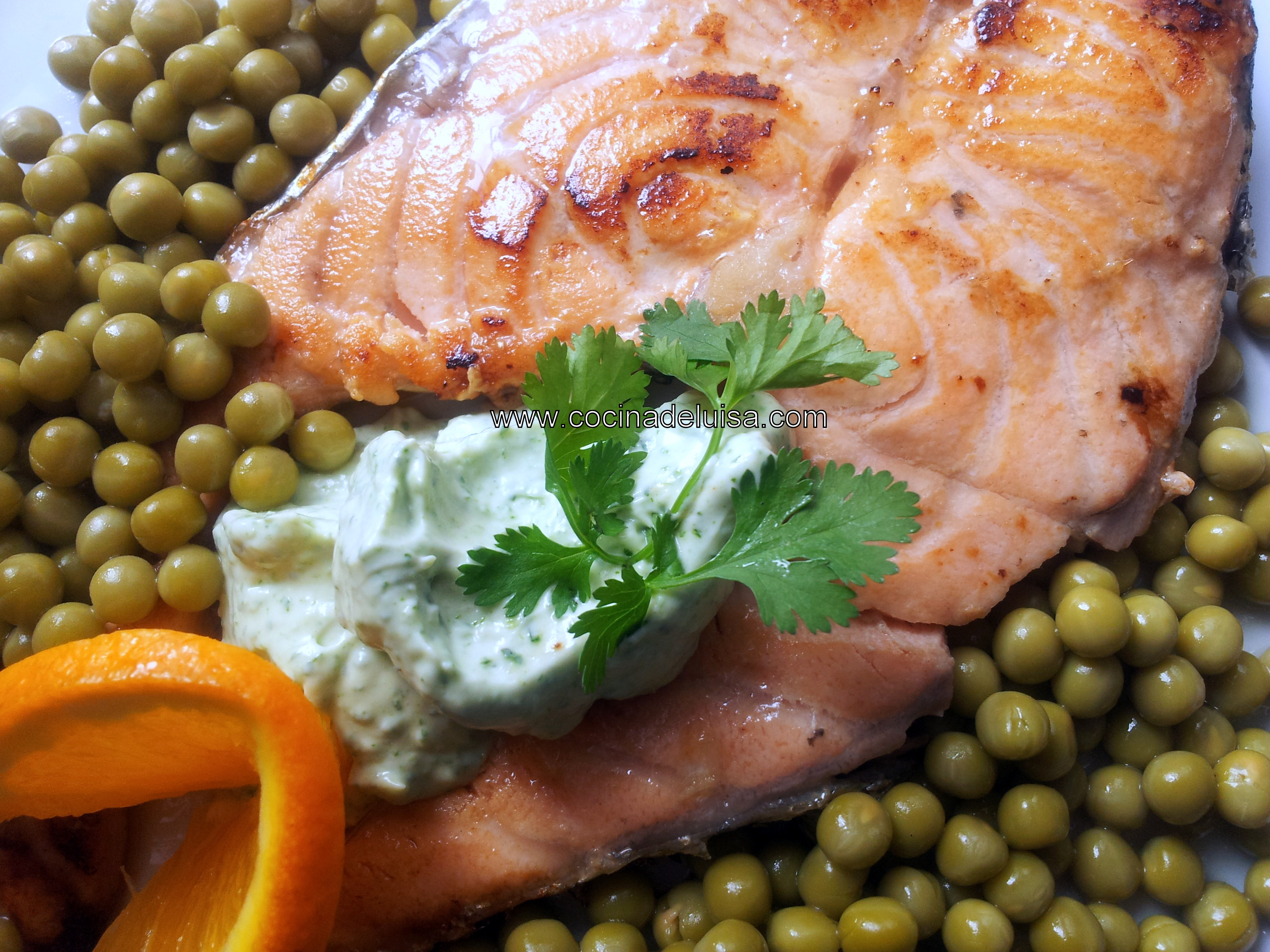 Salmón con guisantes y salsa de cilantro