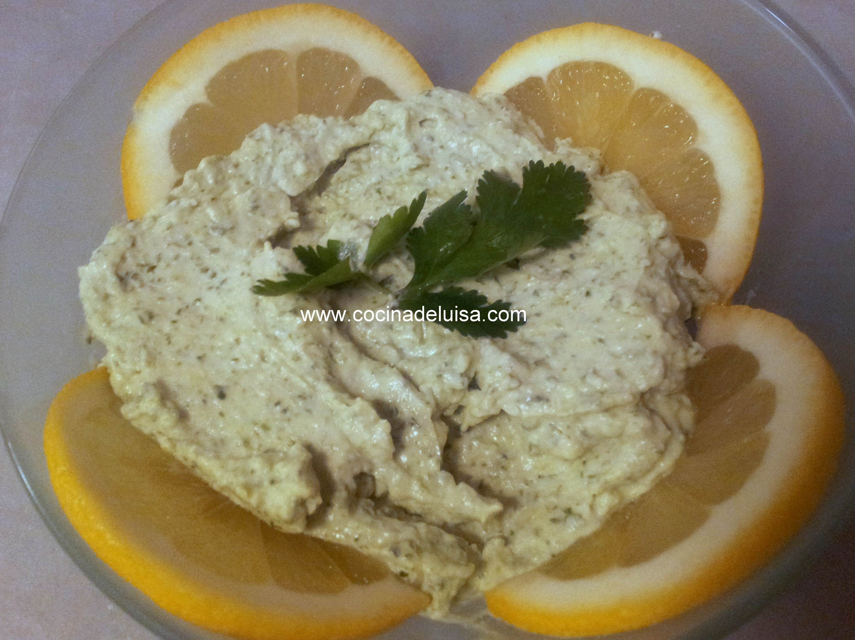 Poner en un vaso para batir el aceite de girasol. Después las claras de huevo, el zumo de dos limones y una pizca de sal. Batir con la minipimer  sin moverla durante un rato hasta que se vea que ha espesado. Después añadir un buen ramo de cilantro y la cucharadita de azúcar. Seguir batiendo hasta que esté todo bien mezclado y servir sobre lecho de rodajas de limón.