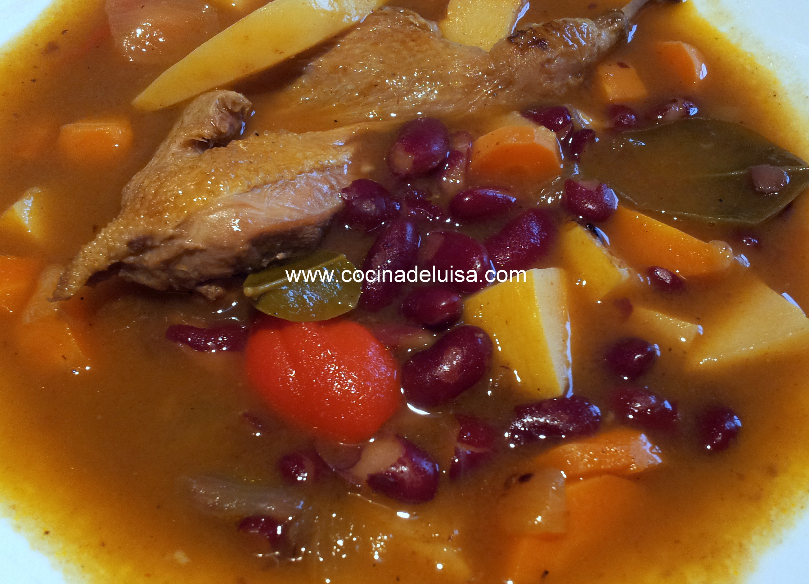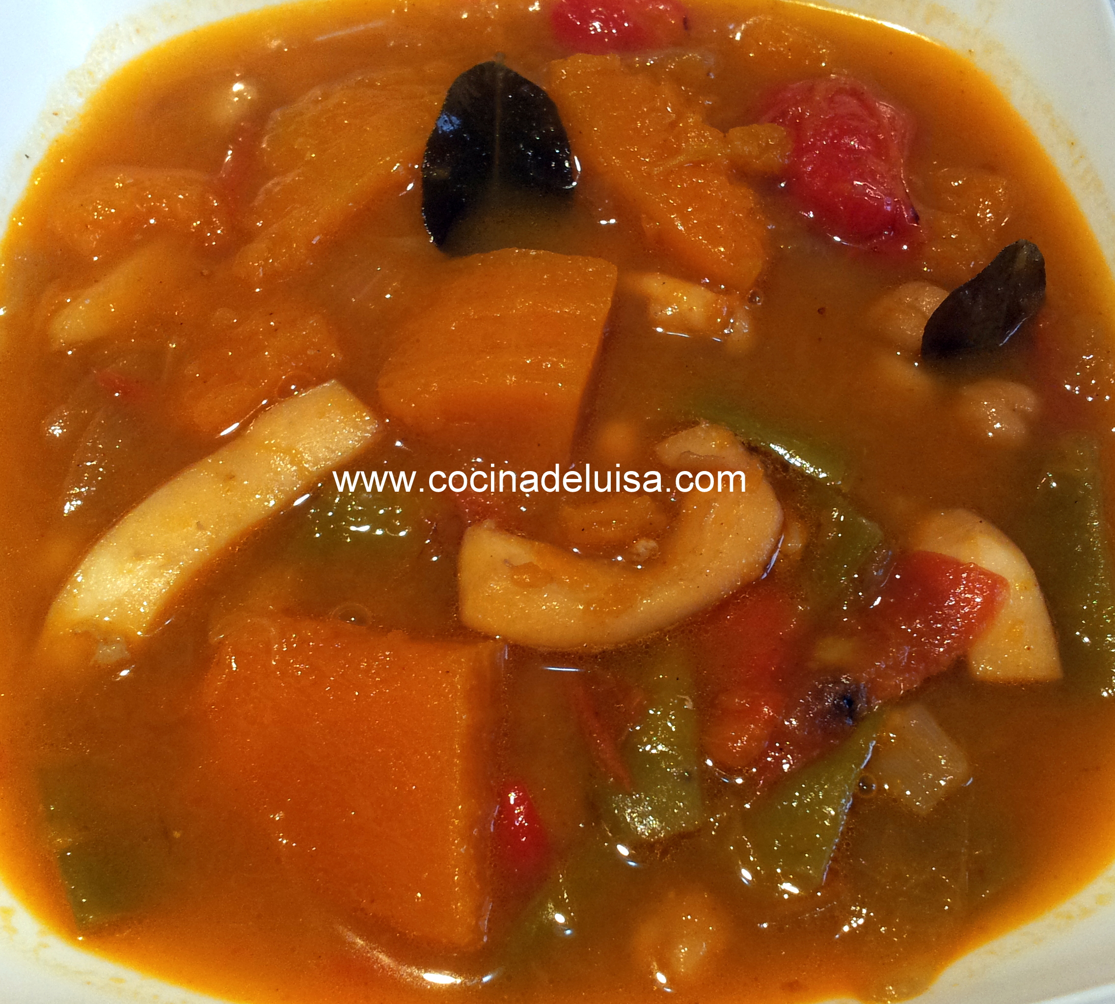 Poner el aceite en una olla de acero inox. Cuando esté bien caliente añadir la cebolla, el pimiento rojo y el choco todo junto, pelado y troceado. Rehogar unos minutos a fuego vivo y cuando empiece a pochar añadir el pimentón y el vino. Darle unas vueltas y poner agua, aproximadamente 600cc. Cuando empiece a hervir añadir los garbanzos, las judías verdes troceadas y la calabaza en trozos grandes para que no se deshaga así como las hojas de lima, sal y pimienta. Dejar cocer con la olla tapada a fuego lento durante 20 minutos. En una sartén poner 2 cucharadas de aceite y cuando esté caliente echar las dos cucharadas rasas de harina de mandioca para tostarla. Remover y poner seguidamente un cazo de caldo del guiso. Trabarlo bien y verterlo en el potaje, dejándolo cocer 5 o 10 minutos más. Éste será más sabroso si se hace por la mañana y se deja reposar hasta la hora de comer en que sólo habrá que calentarlo. La fusión entre el aroma del choco, las hojas de lima y verduras, el vino y el dulzor de la calabaza proporcionará un caldo delicioso y ligero, a la vez que servirá el guiso de plato único tras una ensalada o aperitivos.