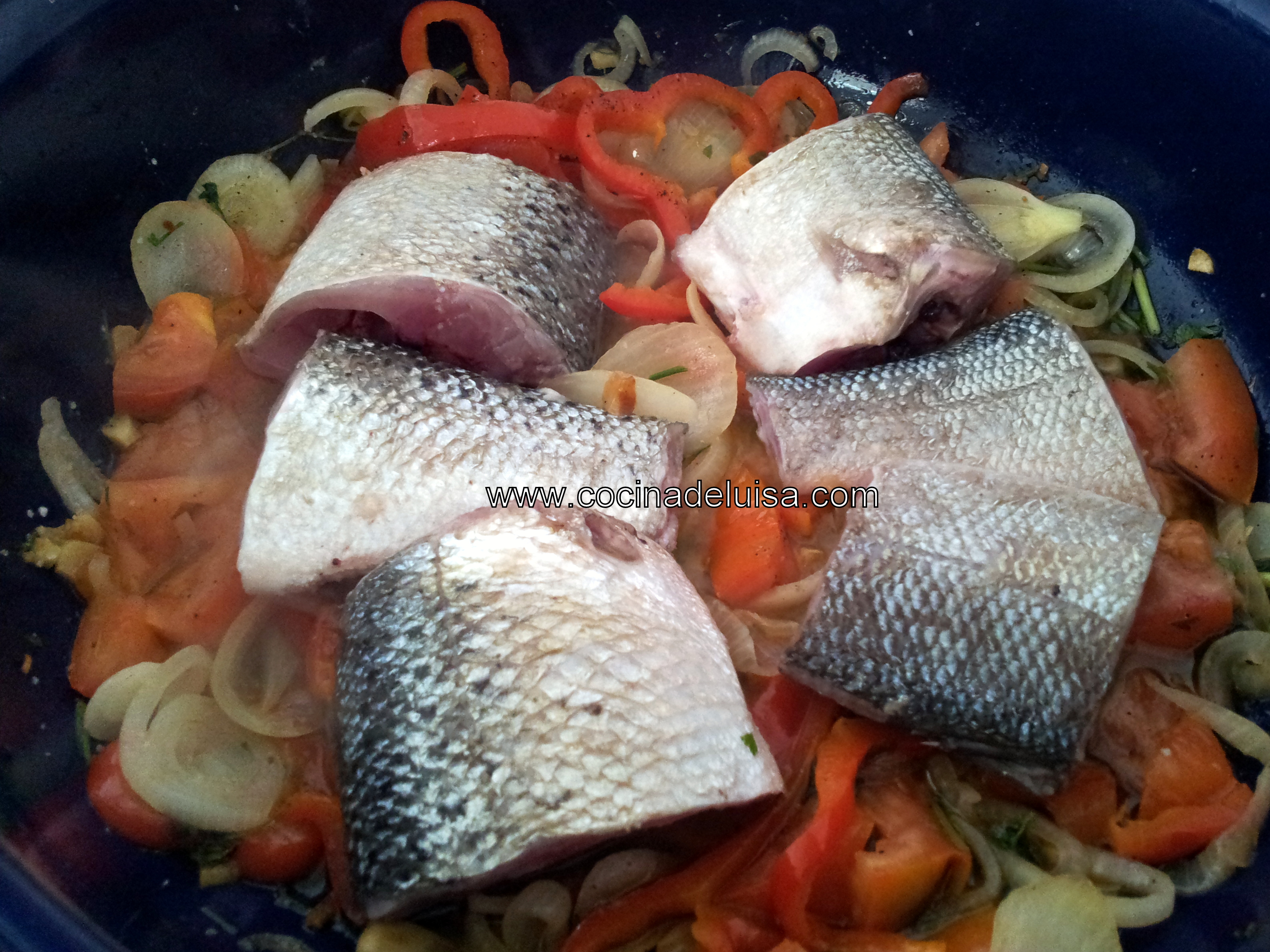 8 rodajas de lubina. 1 cebolla grande. 1 pimiento rojo. 4 dientes de ajo. 2 tomates. 1 chile picado. 2 limones. Cilantro y perejil. 12 langostinos o gambones. Leche de coco. Aceite de oliva. Sal y pimienta.