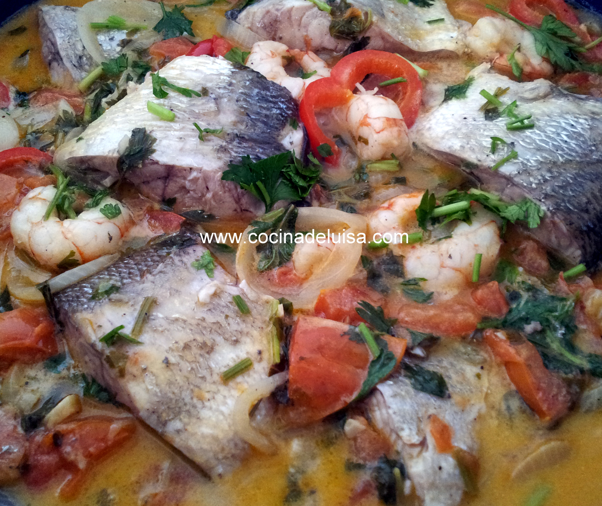 Primeramente disponer las rodajas de pescado en una fuente con jugo de limón y un poco de sal. Meter en el frigorífico 15 minutos. Mientras poner en una olla unas cucharadas de aceite y pochar el ajo muy picado. Antes que empiece a dorar agregar la cebolla y pimiento cortado en aros finos y dejar que empiece a pochar. Entonces añadir parte del tomate cortado en dados junto con el chile picado. Salpimentar y dejar pochar todo hasta que se empiece a ablandar. Poner encima las rodajas de pescado que hemos sacado del frigo. Por encima poner el resto del tomate cortado, otra capa de cilantro y perejil y un vasito de agua o caldo de pescado junto con otro de leche de coco. Dejar cocer quince/ veinte minutos y después poner los langostinos. Remover la olla a un lado y a otro con las dos manos. Cuando los langostinos cambien de color ya puede apagarse el fuego. Dejar reposar cinco minutos y a la hora de servir, añadir una última capa de cilantro y perejil muy picado.