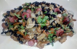 1 vaso de frijoles, 8 porciones de longaniza blanca fresca, 1 cebolla, 300 gr de setas variadas de mercado. 1 ramito de cilantro o perejil, 3 dientes de ajo, 1/2 cucharadita de pimentón picante, 1 dl de aceite de oliva Virgen Extra, 1 copita de vino de Jerez tipo Cream, sal y pimienta.