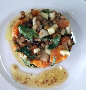 Sofreir en una olla o cazuela la cebolla y dos dientes de ajo troceados junto con el choco o calamar cortado en dados. Cuando esté todo bien dorado añadir el tomate y dejar pochar. Después añadir el pimentón, un poco de vino y un litro y medio de caldo al que añadiremos la verdura muy finamente picada y el ramo de cilantro. Dar un hervor con las verduras y después echar el arroz dejando que hierva en total unos veinte minutos. Cinco minutos antes de acabar agregar las almejas y todo el marisco que tenemos salteado y reservado para que suelten sus jugos.