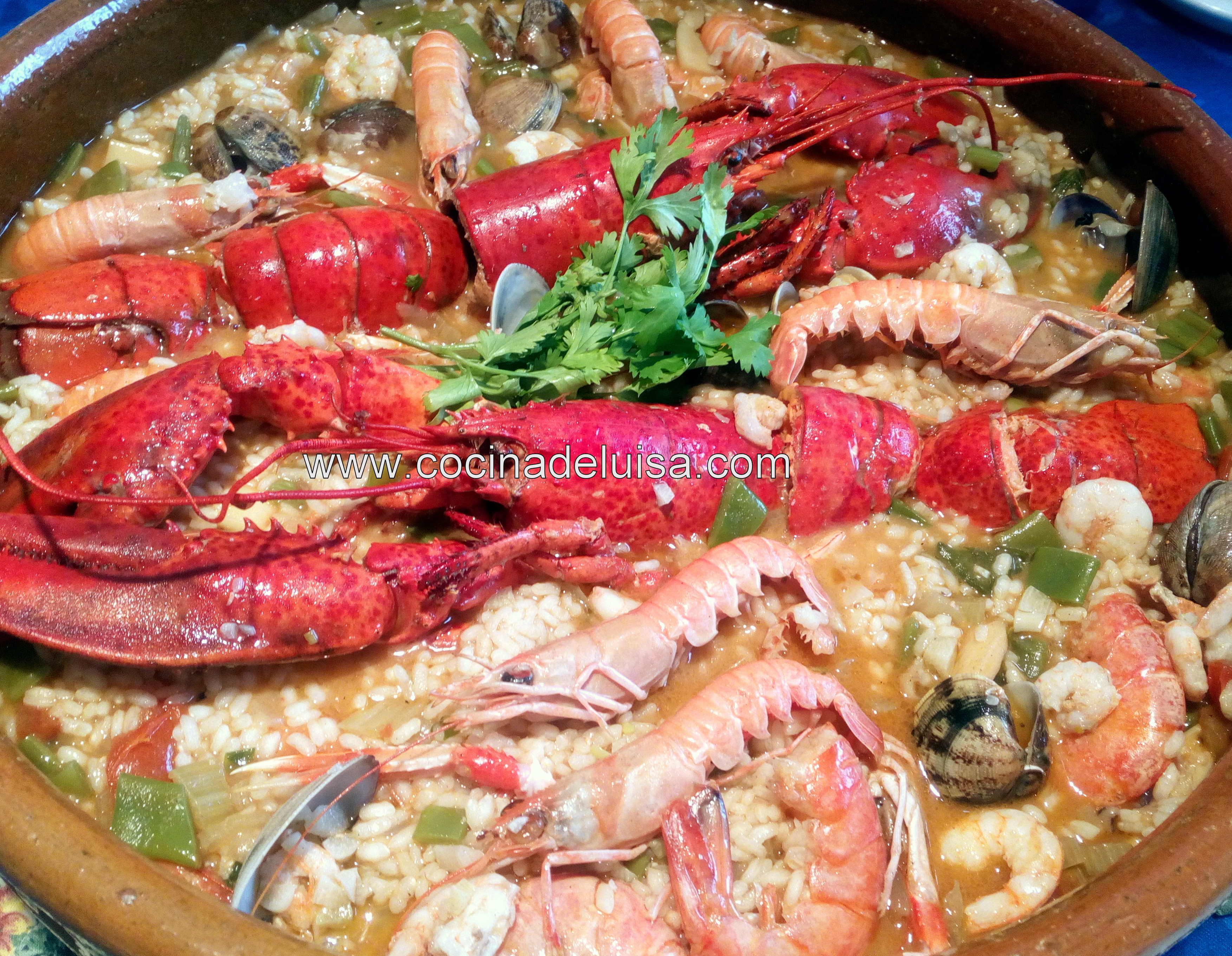 500 gr de arroz de grano redondo. 2 bogavantes de 750 gr. aproximadamente. 1/2 kg de cigalas. 1/2 kg de gambones. 350 gr de gambas. 1/2 kg de almejas. 350 gr. de choco o de calamar. 1 cebolla. 1 tomate. 4 dientes de ajo. 300 gr de pencas de acelgas. 300 gr de judías verdes planas. Un ramo de cilantro fresco. 1 cucharadita rasa de pimentón de La Vera, dulce y otra picante. 1 vasito de vino blanco amontillado. Aceite de oliva Virgen extra. Sal y pimienta.