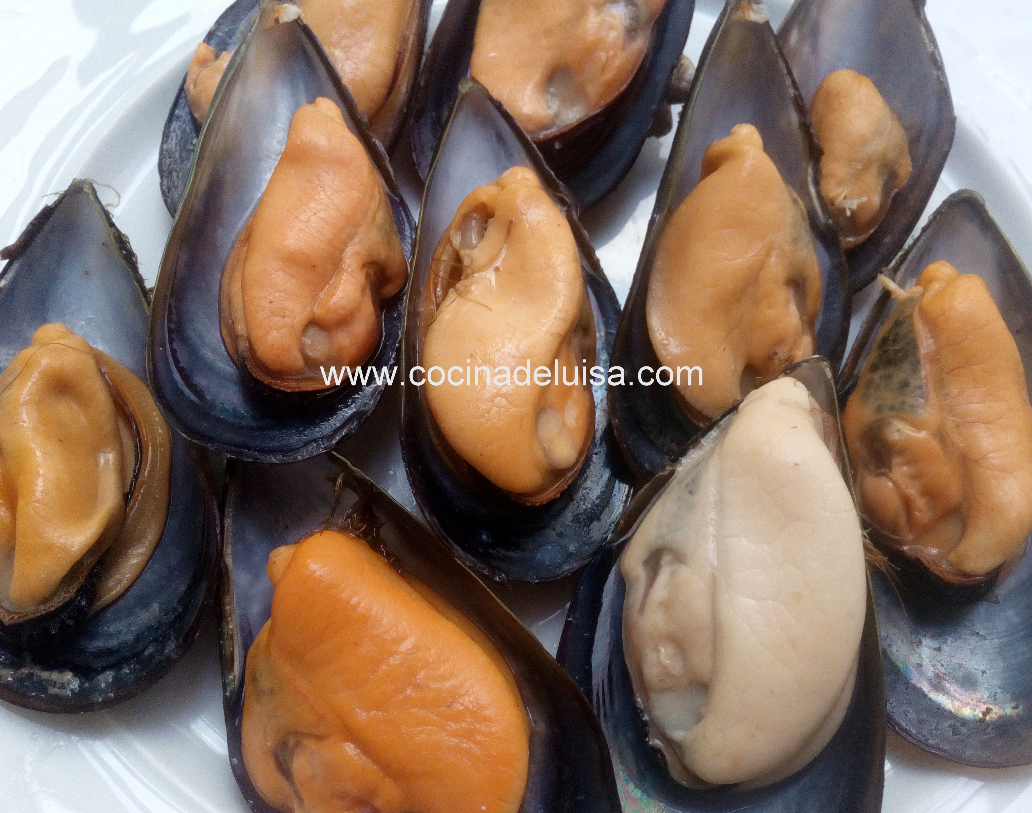 Poner los mejillones en una cazuela tapada y sin agua hasta que se abran al vapor y suelten su caldo. Sacarlos enseguida sin dejar que cuezan mucho para que no se encojan de tamaño y reservar dispuestos cada uno de ellos en una de sus valvas.