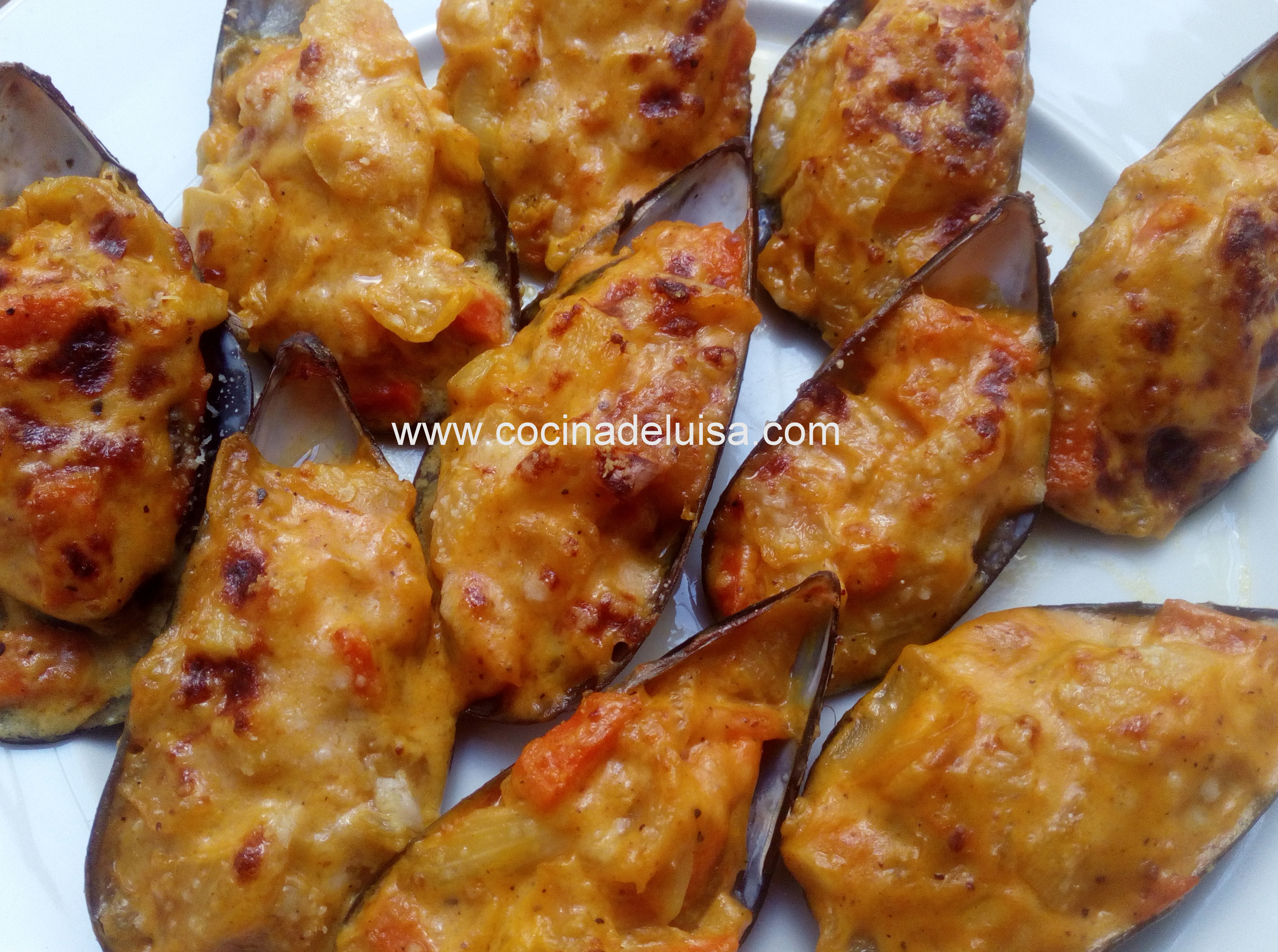 Recubrir los mejillones con abundante bechamel y espolvorear con el queso parmesano rallado. Ponerlos en una bandeja de horno y gratinar a fuego moderado hasta que empiecen a dorar. Apagar el horno y mantener en él unos minutos más los mejillones. Servir calientes.