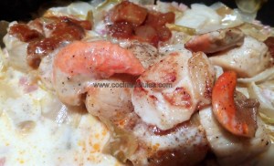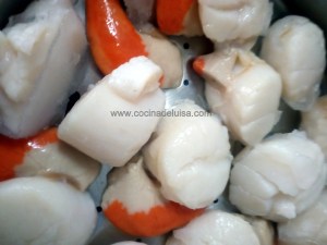 1 docena de vieiras. 2 endivias. 2 tomates. 50 gr de mantequilla. 1 vasito de aceite de oliva virgen extra. 1 cebolla. 1 vasito de crema fresca o nata de guisar. 1 vasito de sidra. Sal y pimienta