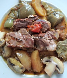 2 piernas cortadas en dos trozos cada una, (en total 1kg y medio aproximadamente de carne). 1kg de alcachofas frescas. 1/2 kg de champiñones. 2 manzanas. 3 cucharadas de miel. 1 tomate. 1 limón. 1 cebolla grande. 4 ramas de tomillo. 2 hojas de laurel. 1 cabeza de ajos. 1 vasito de vino blanco. Aceite de oliva virgen extra. Sal, comino molido y pimienta.