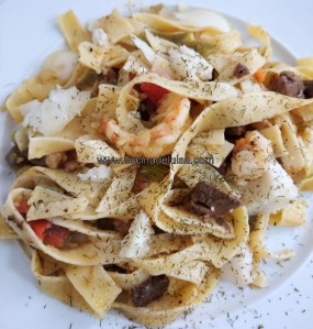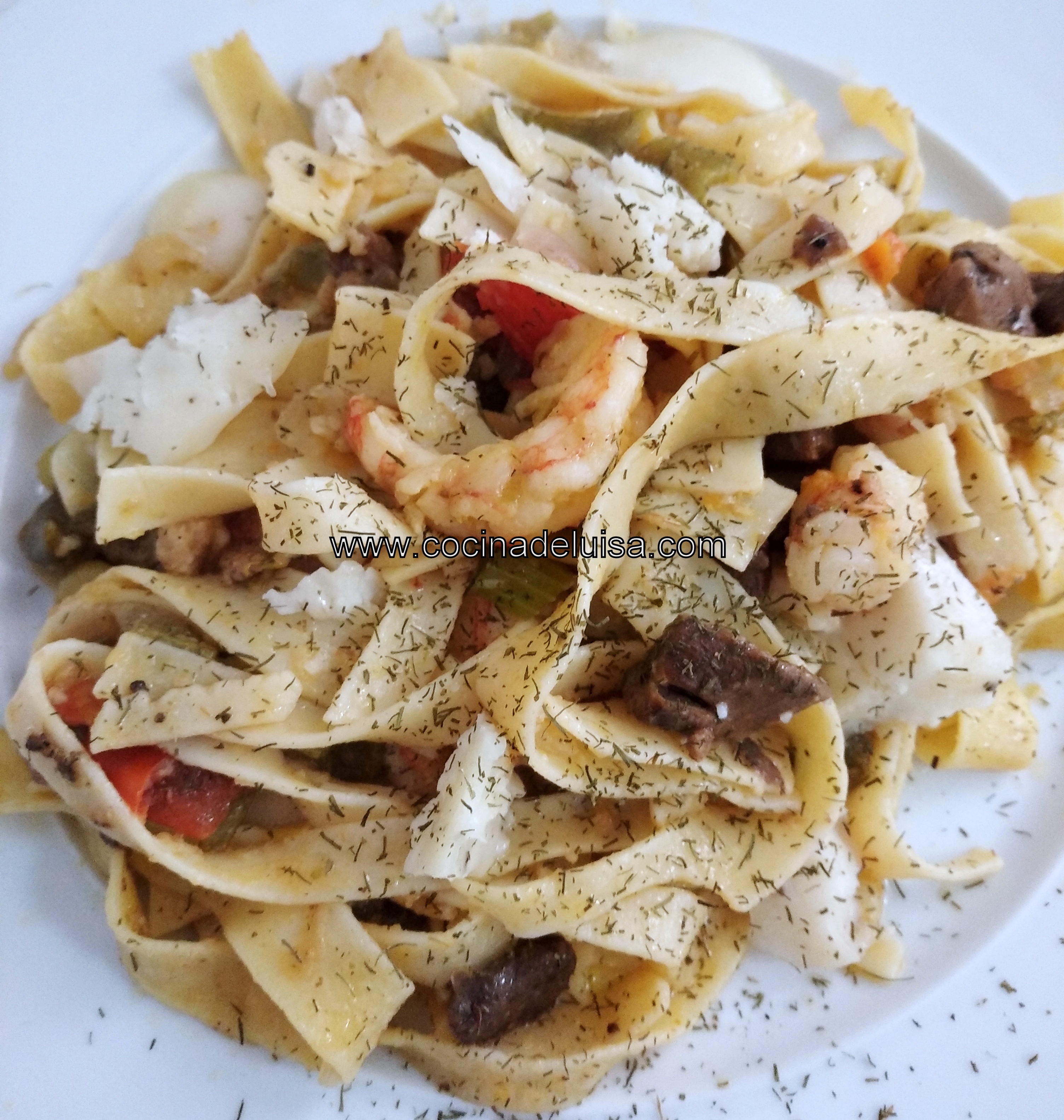 Tallarines de pasta fresca 500 gr. 1 cebolla mediana. 1 zanahoria. 1 pimiento morrón pequeño. 300 gr de gambas peladas. 2 paquetes de «Boletus y Trufa» de la marca Arotz o similar, que ya vienen listos para comer. Queso tierno a la pimienta. Sal, pimienta y albahaca o eneldo secos.