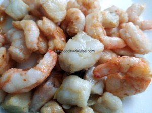 Pochar la cebolla, el pimiento y la zanahoria troceados. Cocer las gambas en abundante agua hirviendo, durante un minuto, después pelarlas, añadirlas a la verdura ya pochada y reservar el agua. Añadir asimismo los dos paquetes de boletus. Remover todo y salpimentar.