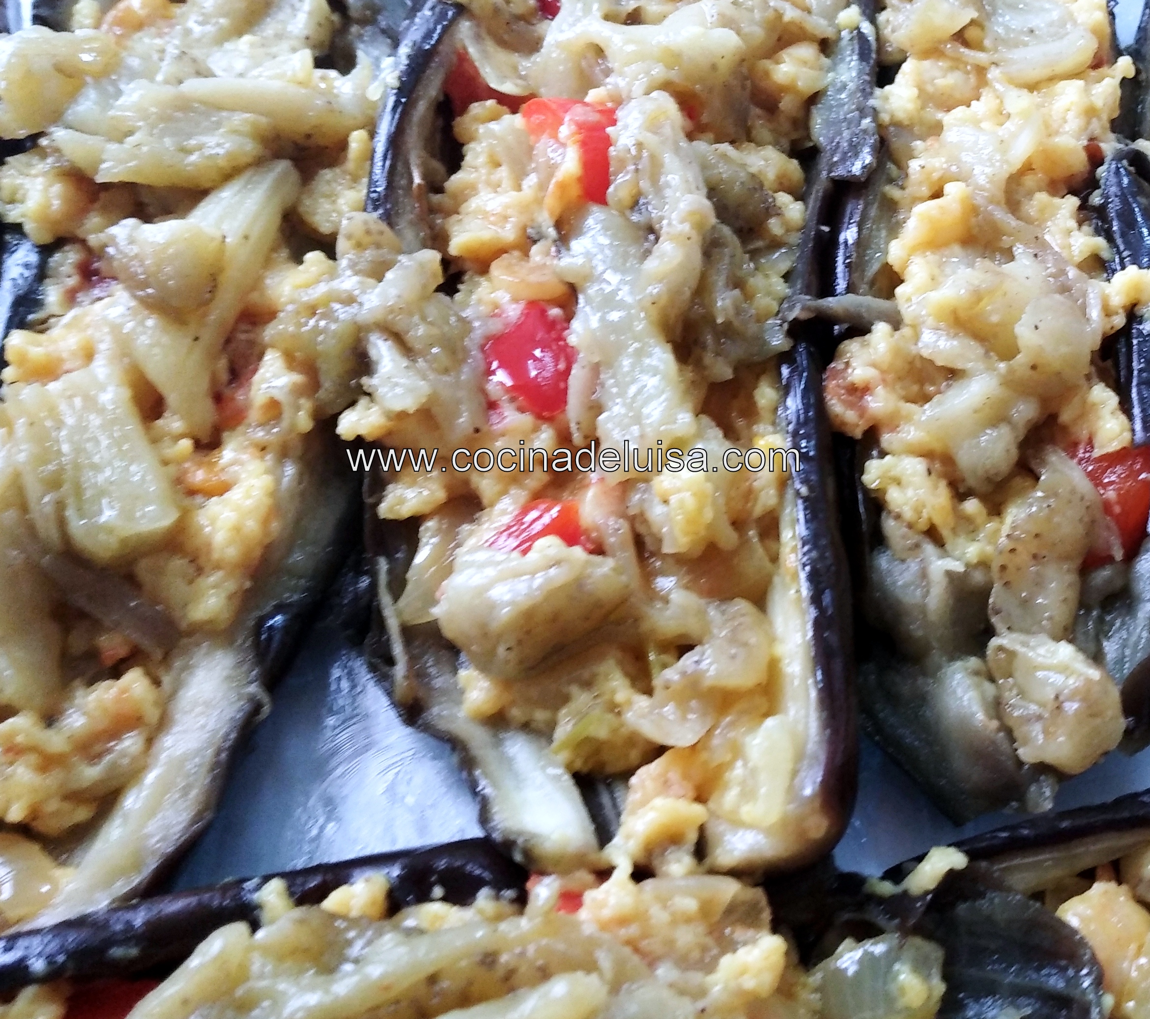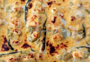 Hacer una bechamel clara con la harina sobrante, leche y ralladura de nuez moscada. Embadurnar una fuente de horno con mantequilla. Encima colocar las berenjenas a las que hemos puesto previamente el relleno. Verter por encima la bechamel hasta cubrir las berenjenas rellenas. Poner al horno precalentado a 170 grados durante 15/20 minutos, hasta que empiece a dorar por arriba.