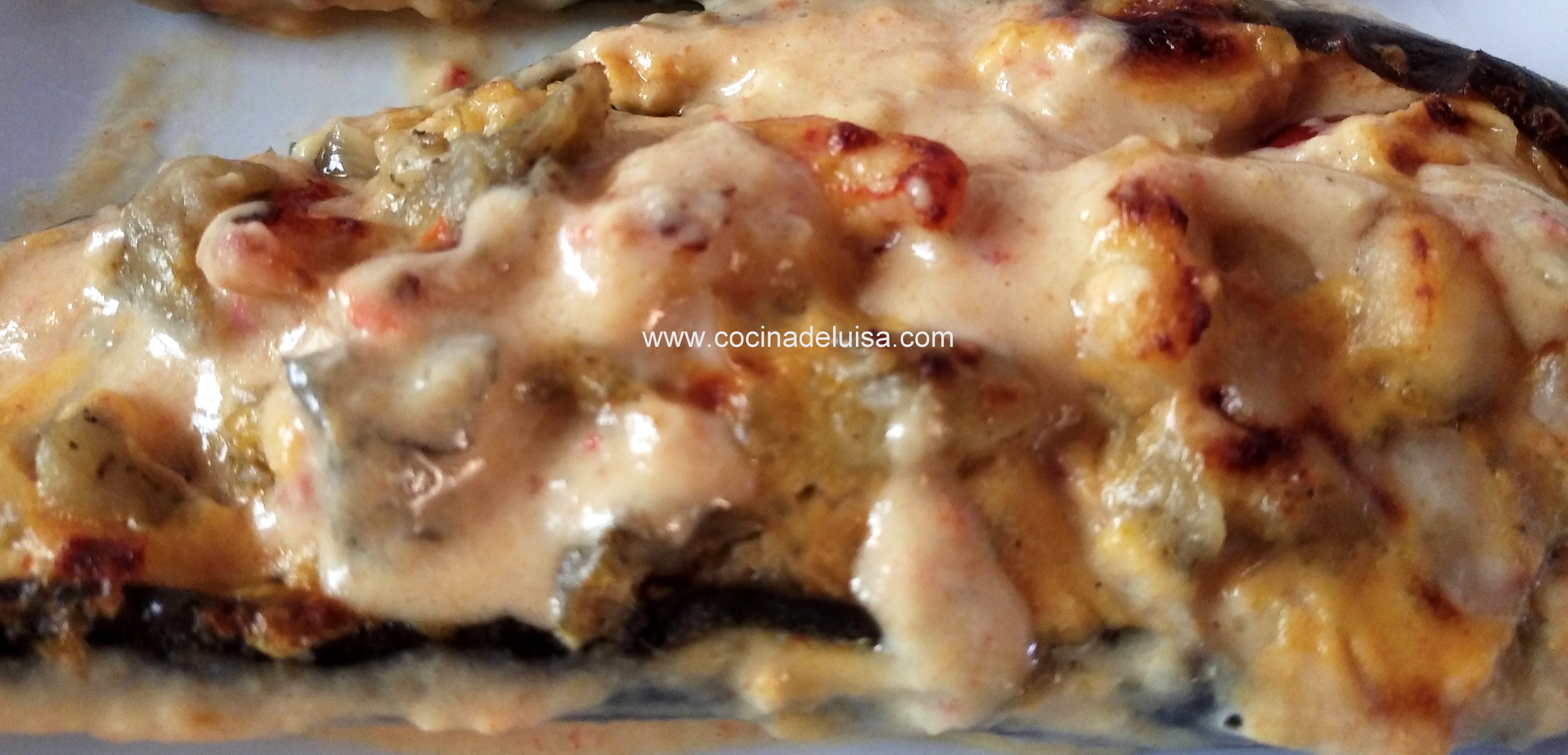 4 berenjenas. 1 cebolla. 1 tomate. 1 pimiento rojo. 1 tallo de apio. 250 gr de gambones pelados. 250 gr de taquitos de rape. 2 cucharadas  de harina. 1 taza de leche entera. 1 nuez de mantequilla. Sal, pimienta y nuez moscada. Queso rallado, opcional.