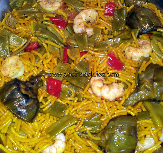 1/2 kilo de arroz redondo, tipo SOS. 1/2 kilo de almejas. 1/2 kilo de cigalitas. 1/2 kilo de gambas. 1 choco mediano. 1/2 kg. de judías verdes. 4 alcahofas. 1 cebolla pequeña. 4 dientes de ajo. 1 tomate. 2 dl. de aceite de oliva V.E. Pimentón de la Vera. Azafrán. 1 vasito de vino Moriles. Sal y pimienta.