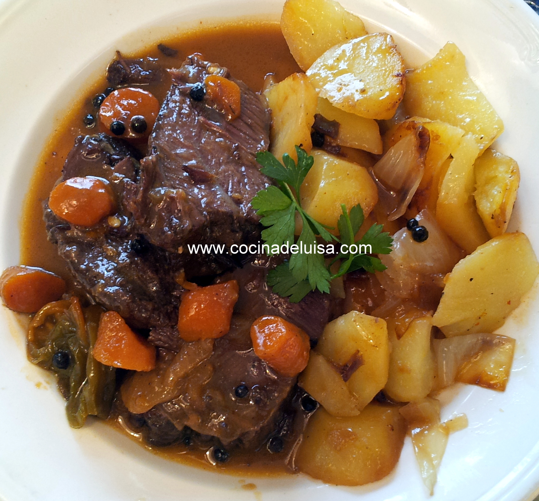 (Para cuatro personas) Durante unos segundos poner tres carrilladas enteras en un poco de aceite muy caliente para que se sellen. Cuando estén doradas, sacarlas y reservarlas. En ese mismo aceite añadir una cebolla mediana en trocitos y dos o tres dientes de ajo enteros. Una vez dorados añadir un tomate mediano troceado bien maduro, y cuando esté pochado añadir las carrilladas, una hoja de laurel y una cucharadita de pimentón de la Vera. Inmediatamente y para que no se queme el pimentón, añadir un vasito pequeño de vino oloroso de Jerez o cualquier otro vino añejo dulzón, por ejemplo vino de naranja de Moguer. Dar unas vueltas al guiso y cubrir a la mitad con agua caliente. Añadir zanahorias en rodajas, sal, pimienta molida y en grano, y dejar cocer hasta que se vea la carne tierna y melosa. Si se hace en olla rápida, reducir la cantidad de agua y  dejar cocer 15 minutos. Luego dejar reposar otro tanto antes de abrir. Se puede servir con unas patatas cocinadas con aceite de oliva a fuego lento.