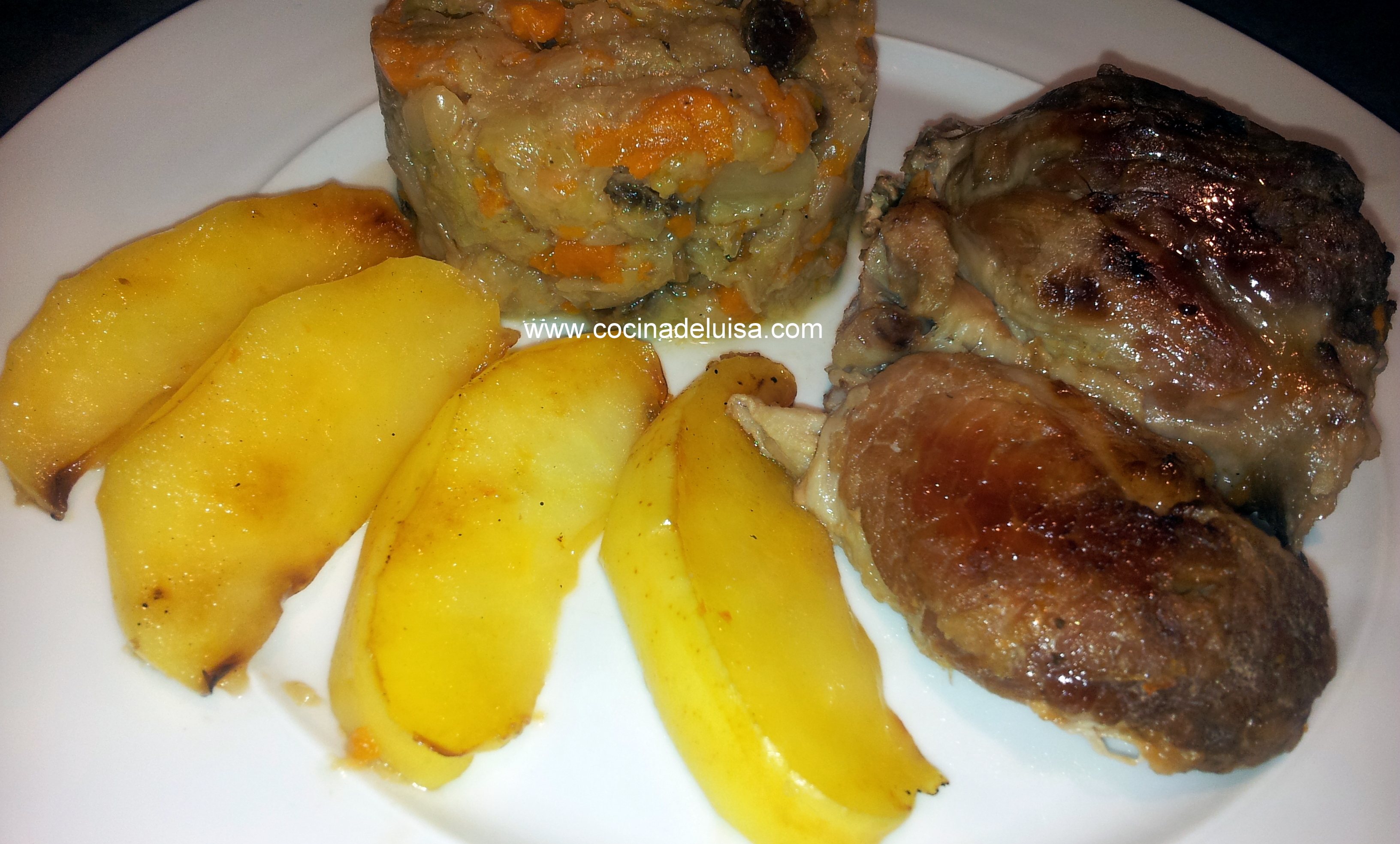 Cocer los codillos en olla express, con abundante agua, junto con la cabeza de ajos, el laurel, el pimiento, el tomate, las guindillas, una cucharadita de pimienta negra en grano y sal. La carne debe quedar muy tierna por lo que debe cocer una hora y cuarto aproximadamente en olla rápida. Mientras tanto cocer la col y zanahorias en agua, con sal y pimienta, hasta que queden muy tiernas. Sacar aparte los codillos desechando el agua y la verdura de su coción. Ponerlos tres o cuatro minutos al gratinador del horno embadurnados con una mezcla de miel y vino oloroso. En cuanto a la col y zanahoria escurrirlas todo lo que se pueda y rehogar todo en una sartén con una pizca de aceite, dos dientes de ajo, tres cucharadas de uvas pasas sin pepitas y bastante vinagre de manzana como para que quede la col ligeramente ácida y contrarreste con el dulzor de las pasas. Por último cortar las manzanas en rodajas y rehogar en una sartén con una cucharadita de mantequilla hasta que se doren. Servir como se ve en la imágen. Es un plato delicioso, económico, sano, sin grasa alguna y facilísimo de elaborar. Solo que lleva más tiempo hacerlo que lo habitual por el excesivo tiempo de coción que precisa la carne.