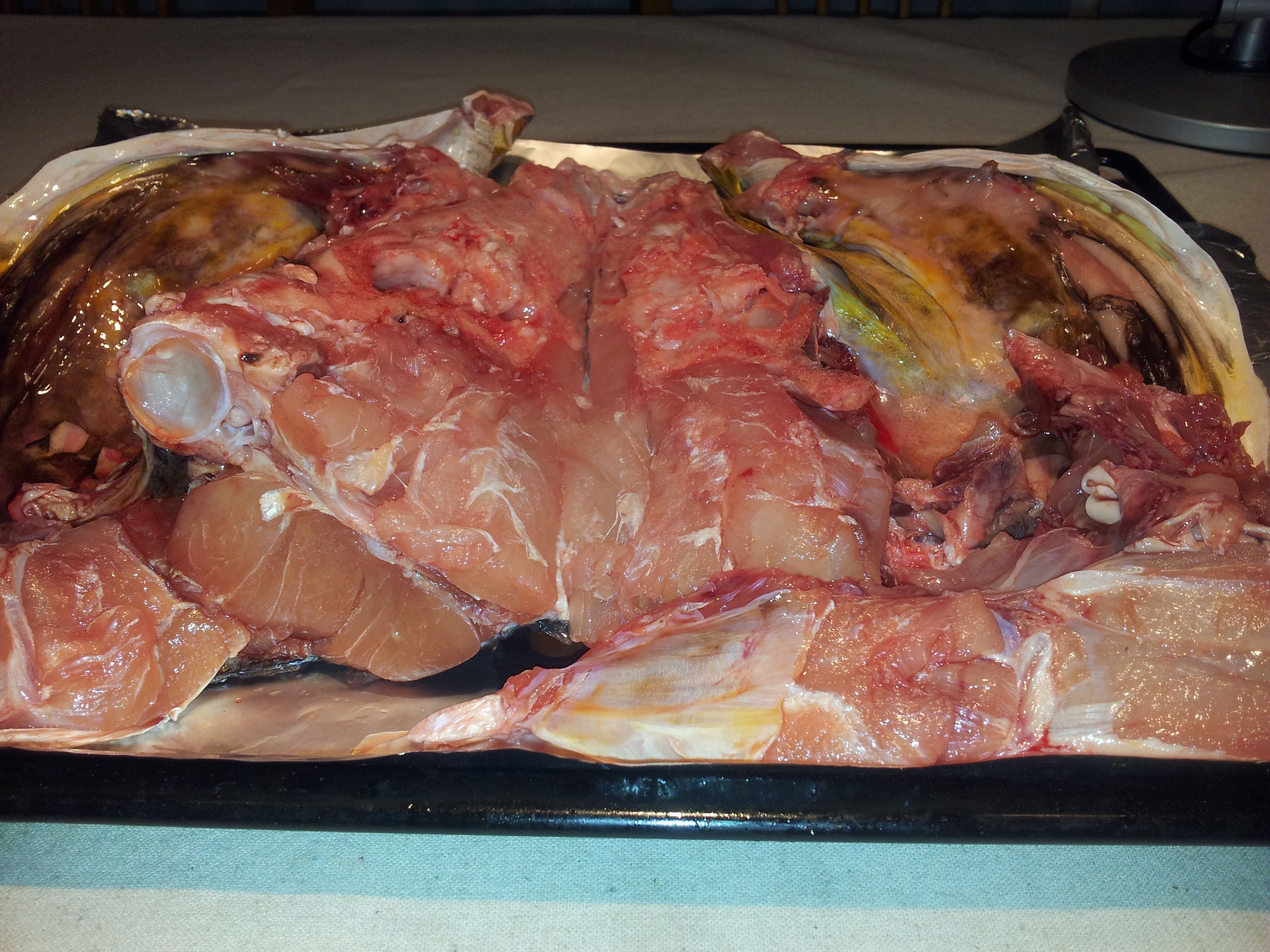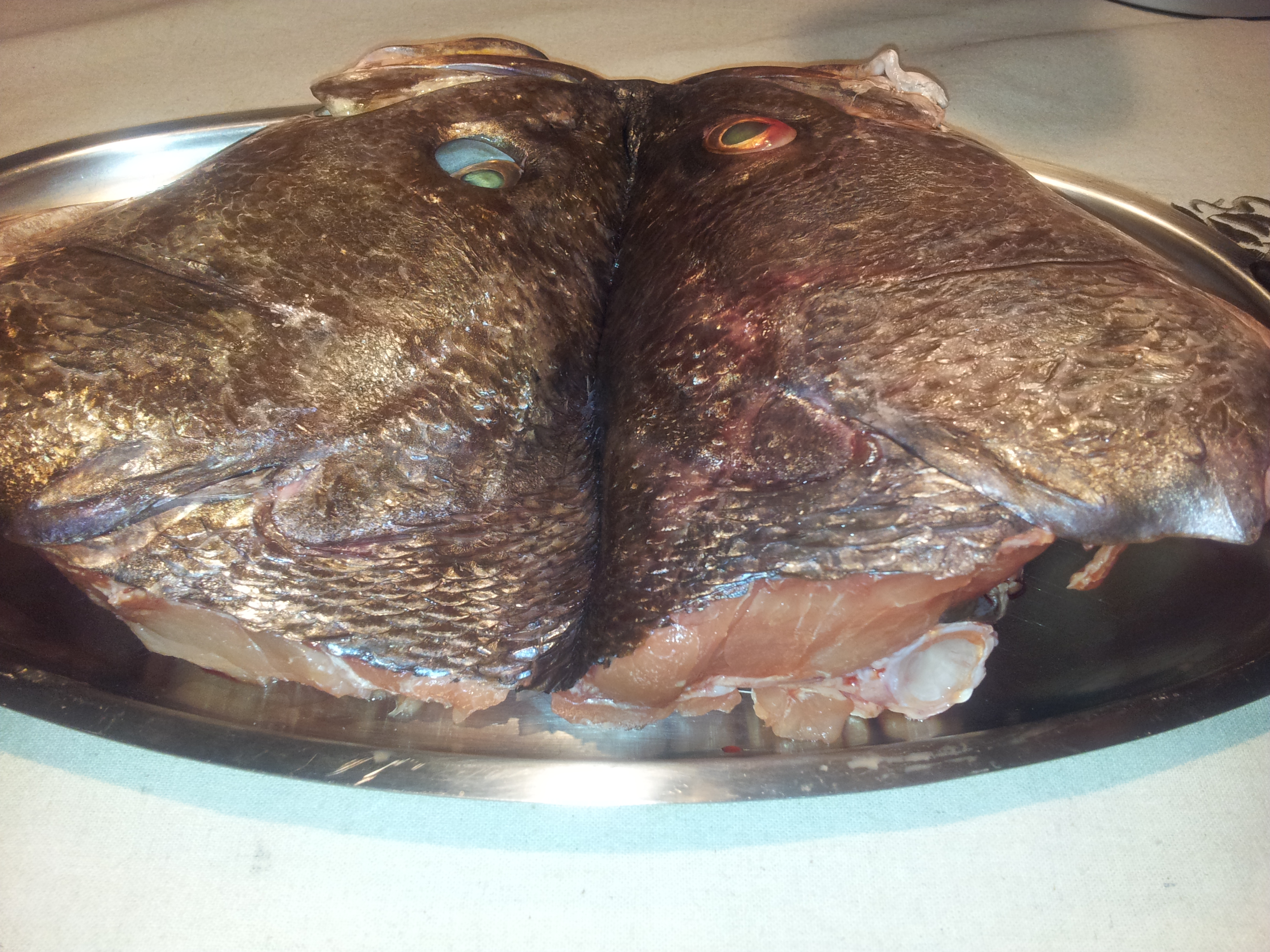 Pedir al pescadero que la limpie de escamas y la abra en dos mitades. En una bandeja de horno colocar la cabeza abierta con las escamas hacia abajo. Salpimentar y rociarla con el jugo del limón y con un aceite de oliva suave aromatizado con guindilla y ajos. Poner al horno a 180 grados durante 40 minutos aproximadamente, dependiendo del tamaño, hasta que se vean los huesos un tanto churrascados. La carne que se esconde debajo de los huesos queda deliciosa, muy suave y jugosa. Se puede acompañar con una mayonesa ligera o con una emulsión hecha con su propio jugo al que se añade un poco de jugo de limón, leche de coco y una hoja de lima muy picada. Buenísima!